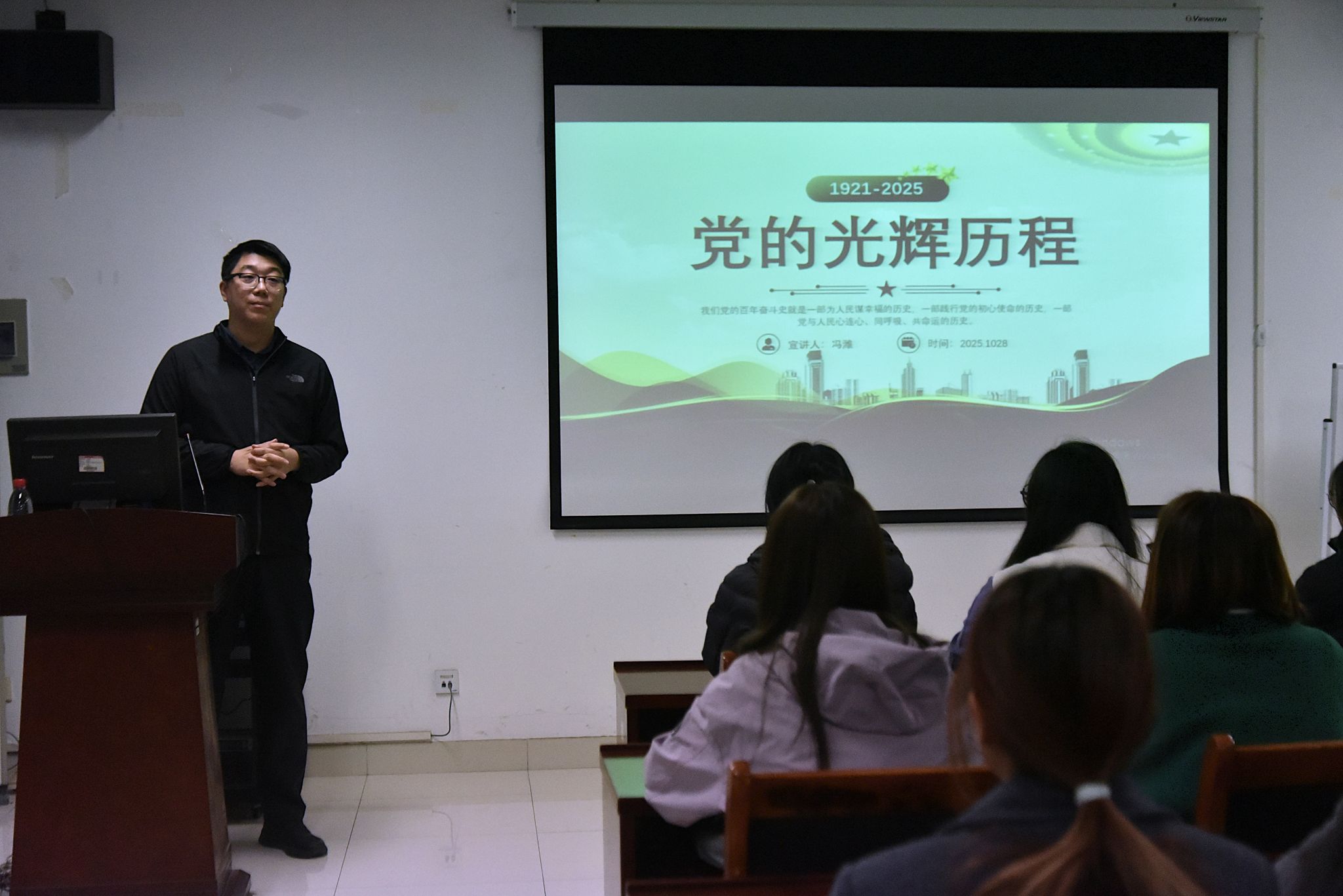 开班仪式后,冯潍以“党的光辉历程”为题讲授党课第一讲,回顾了中国共产党的百年奋斗史,通过讲述党在艰难时期的淬炼与辉煌时刻的成就,深刻阐释了没有共产党就没有新中国的历史必然性。同学们纷纷表示将时刻以党员标准严格要求自己,在思想上淬炼初心、在行动上践行使命、在担当上锤炼品格,努力向党组织靠拢。