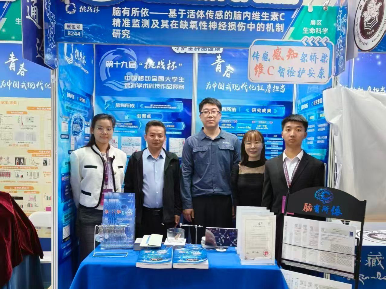 《脑有所依—基于活体传感的脑内维生素C精准监测及其在缺氧性神经损伤中的机制研究》作品由纪文亮、李丽、刘晓彤老师指导,亓子扬、王文谦、谷尚聪、甘思宇、王林胜、贺光越、田慧、马源等本科生共同完成。本项目聚焦缺氧性神经损伤中脑内维生素C动态监测及机制研究,基于碳纳米管修饰微电极开发高灵敏活体传感方法,实现清醒动物脑内维生素C实时精准检测;为揭示缺氧性神经损伤分子机制、开发神经保护策略提供实验依据,助力脑疾病诊疗及抗氧化系统平衡研究。目前,团队成员累积发表论文18篇,申请专利15项、授权4项。