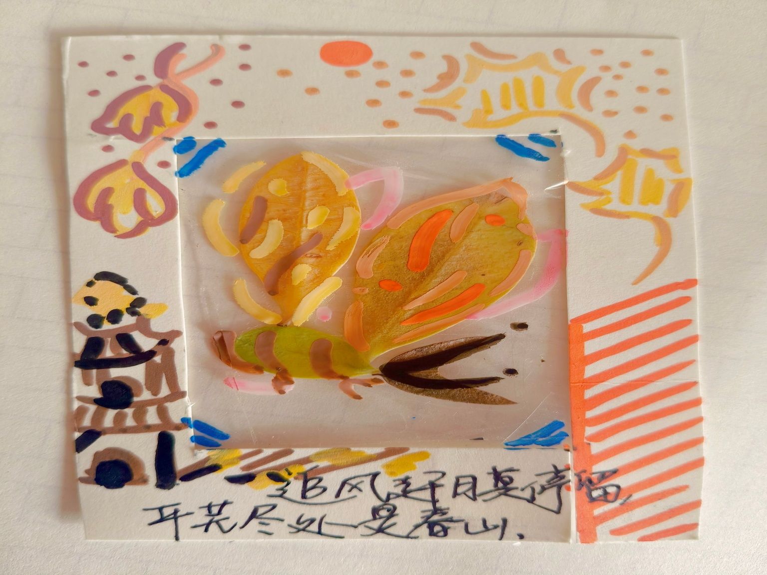 在活动中,学生采集银杏、枫叶等秋日素材,将叶脉的斑斓纹路与叶片的暖黄色彩等自然馈赠化作书签底色,搭配手写寄语,让自然之美与人文温度相融共生,把季节诗意与青春心绪封存在方寸之间。从蹲身择叶时指尖触到的丝丝秋意,到伏案拼贴时胶棒晕开的淡淡黏香,再到将成品夹进书页的瞬间——这些创作过程成为学生暂时卸下“认知过载”压力的契机。活动结束后,参与者表示,将济大的秋天封存在书签里,再翻书时指尖轻触,仿佛就能重新感受到秋日的融融暖意。