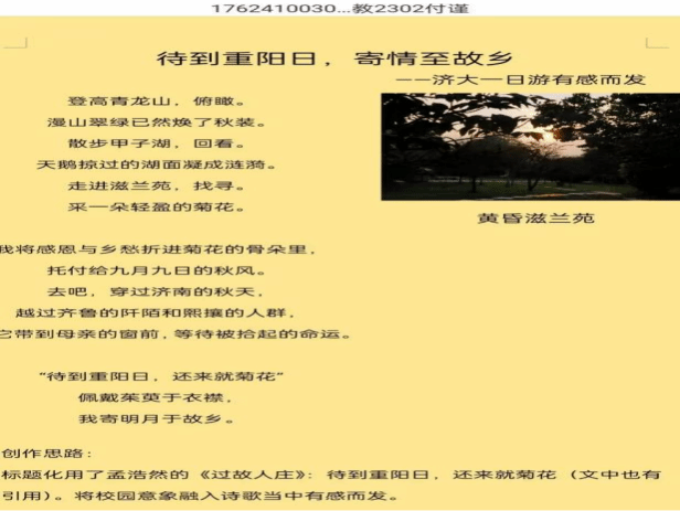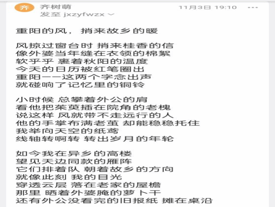 活动以重阳节为文化载体,聚焦“敬老、感恩、思乡”核心主题,面向全院学子发起原创诗词创作征集。活动启动后,同学们踊跃参与,纷纷结合自身生活体验与情感共鸣,在遵循传统诗词格律韵味的同时,融入新时代青年的思考与表达,创作出一批情真意切、格调高雅的优秀作品——既有抒发对长辈养育之恩的深情之作,也有寄托异乡求学思乡之情的动人篇章,充分展现了色情视频