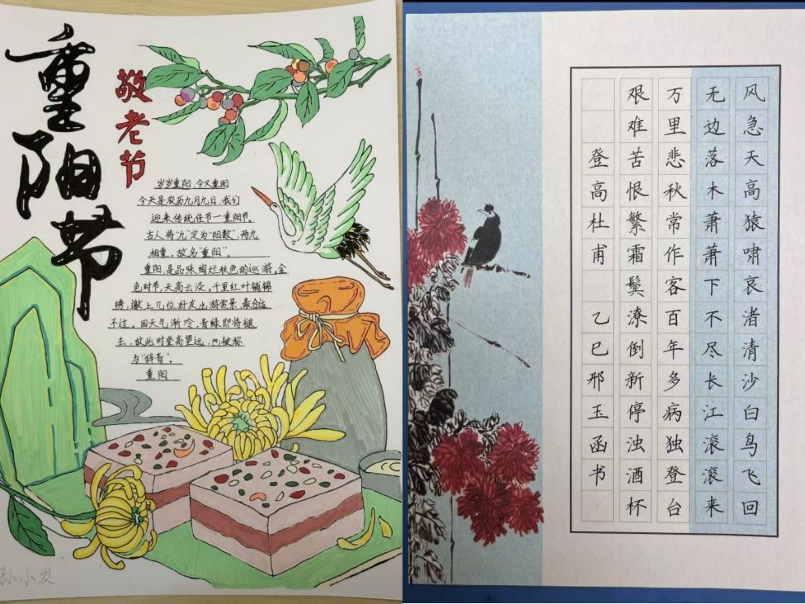 硬笔书法比赛中,学生执起钢笔或中性笔,笔尖落纸时,诗词的平仄韵律与经典名句的人文温度,便随横竖撇捺的笔锋流转开来,在一笔一划间细细品读汉字的形神之美,涵养专注力与文化传承的意识;手抄报设计比赛里,学生则以纸为卷、以笔为媒,勾绘登高插萸的民俗途经,晕染敬老思亲的温情氛围,在文字里追溯重阳“辞青”“敬老”的历史渊源,在插画里描绘“遥知兄弟登高处”的家国情怀,在创意布局与色彩搭配中激发创造力。