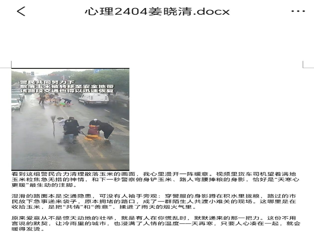 活动中,同学们搜集并截图保存触动心灵的新闻瞬间,再以真挚文字撰写个人感悟。征集期间,大量饱含温度的作品涌来:从路人自发帮忙捡拾洒落的玉米,到社区为外卖员特设暖心厨房;从街头陌生人的举手相助,到基层工作者的默默坚守,同学们发掘的故事覆盖社会生活方方面面,每一张截图都是人性光辉的生动定格,每一段感悟都是青年视角的深刻共鸣。“寒风再烈,也抵不过人心的滚烫”“秋冬的寒凉或许无法避免,但人与人之间的善意与关怀,总能汇聚成驱散寒意的暖流”——这些直白又真挚的话语,是同学们对社会温情的细腻解读。